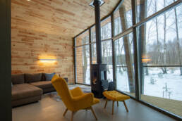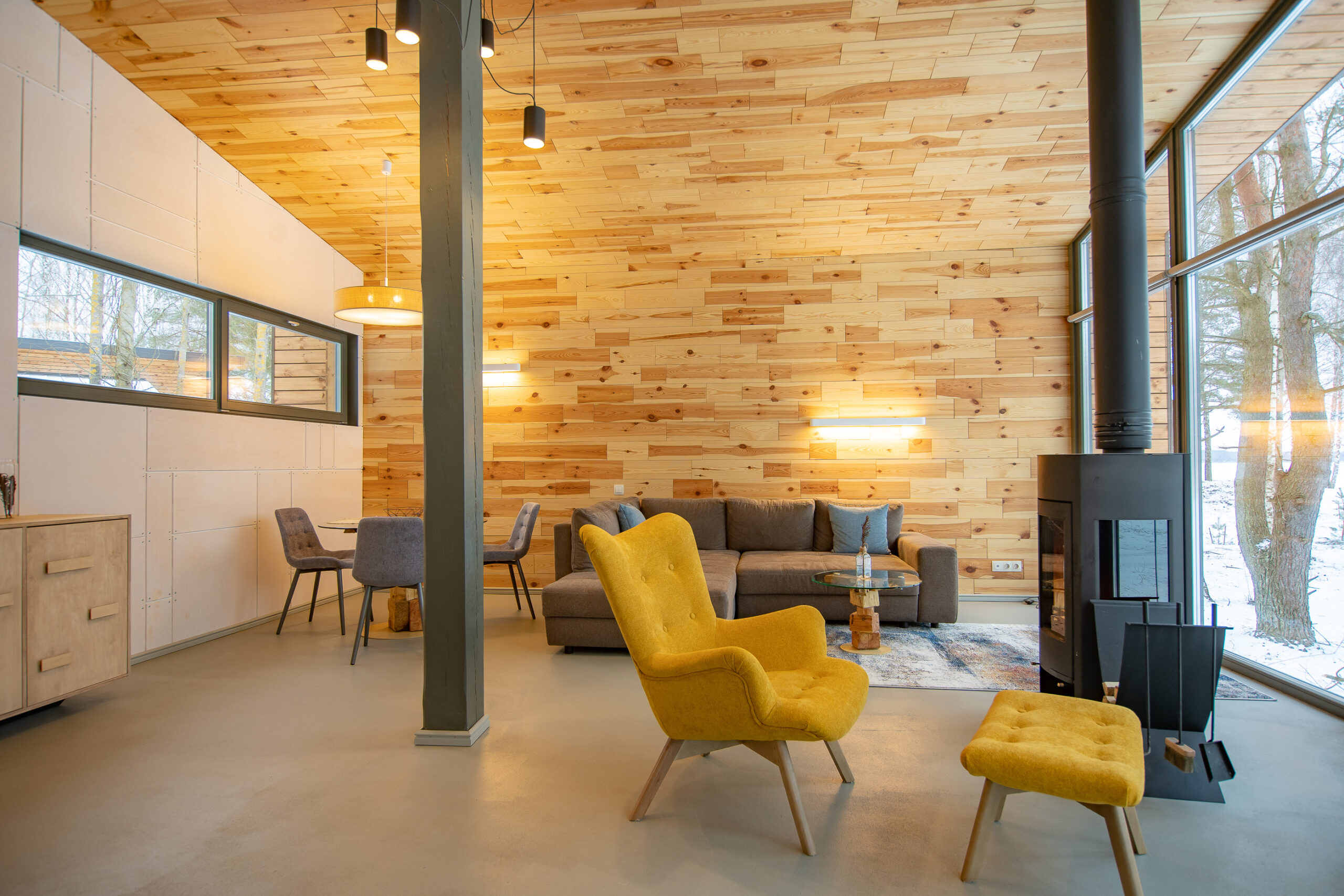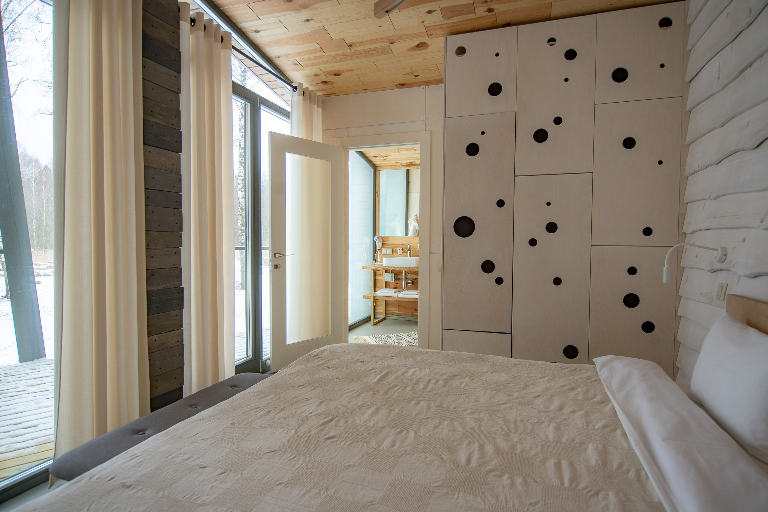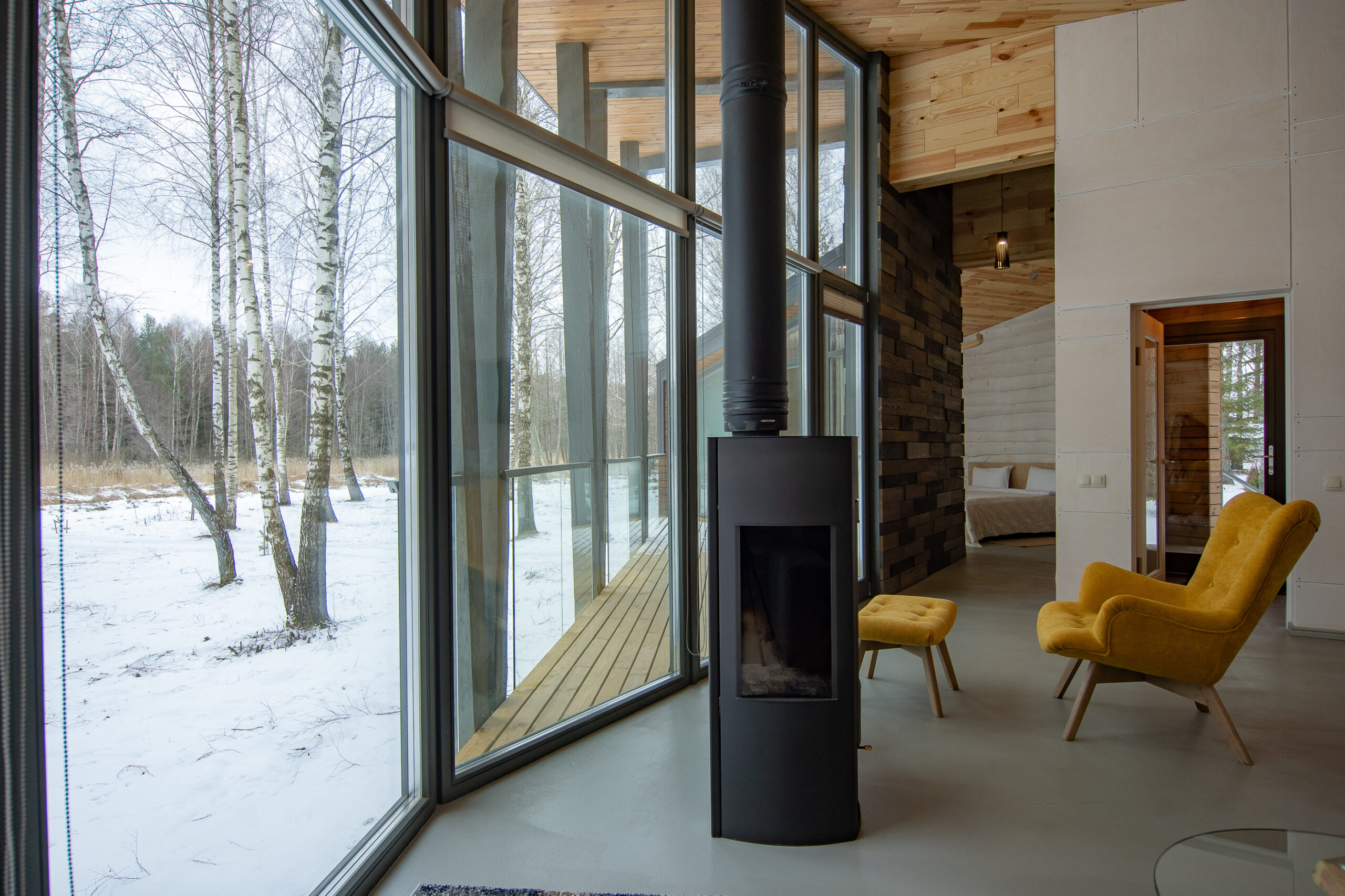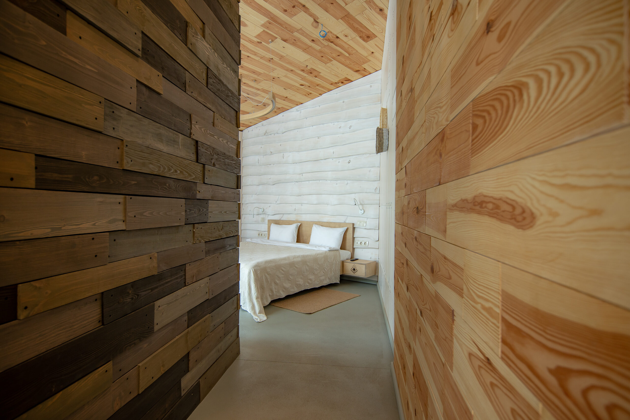 Реализованный дизайн интерьера. Главная задача дизайна дома — слияние с природой. Дом предназначен для отдыха и проживания 2-5 человек. В доме расположена спальня, сан. узел с душевой, гостиная (мини-кухня с столовой зоной, диван с камином). С террасы открывается вид на лес и озеро. Выход на террасу из гостиной и спальни. В проекте предусмотрены высокие разноуровневые потолки и большая площадь остекления- что делает пространство визуально больше. В отделке использованы натуральные материалы из дерева в трех вариациях: фанера окрашенная, отделочная доска на стенах и потолке, доска стилизованная под амбарную доску в зоне коридора и террасы. В сан. узле также использована отделка из дерева. Душевой угол сделан из широкоформатной плитки на стенах в тон дерева, на полу плитка. Зоны хранения в коридоре и спальне сделаны из отделочного материала — фанеры, который использован в доме. Отопление — водяные теплые полы по всем помещениям. Пол бетонный, окрашен специальной краской для жилых помещений.