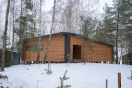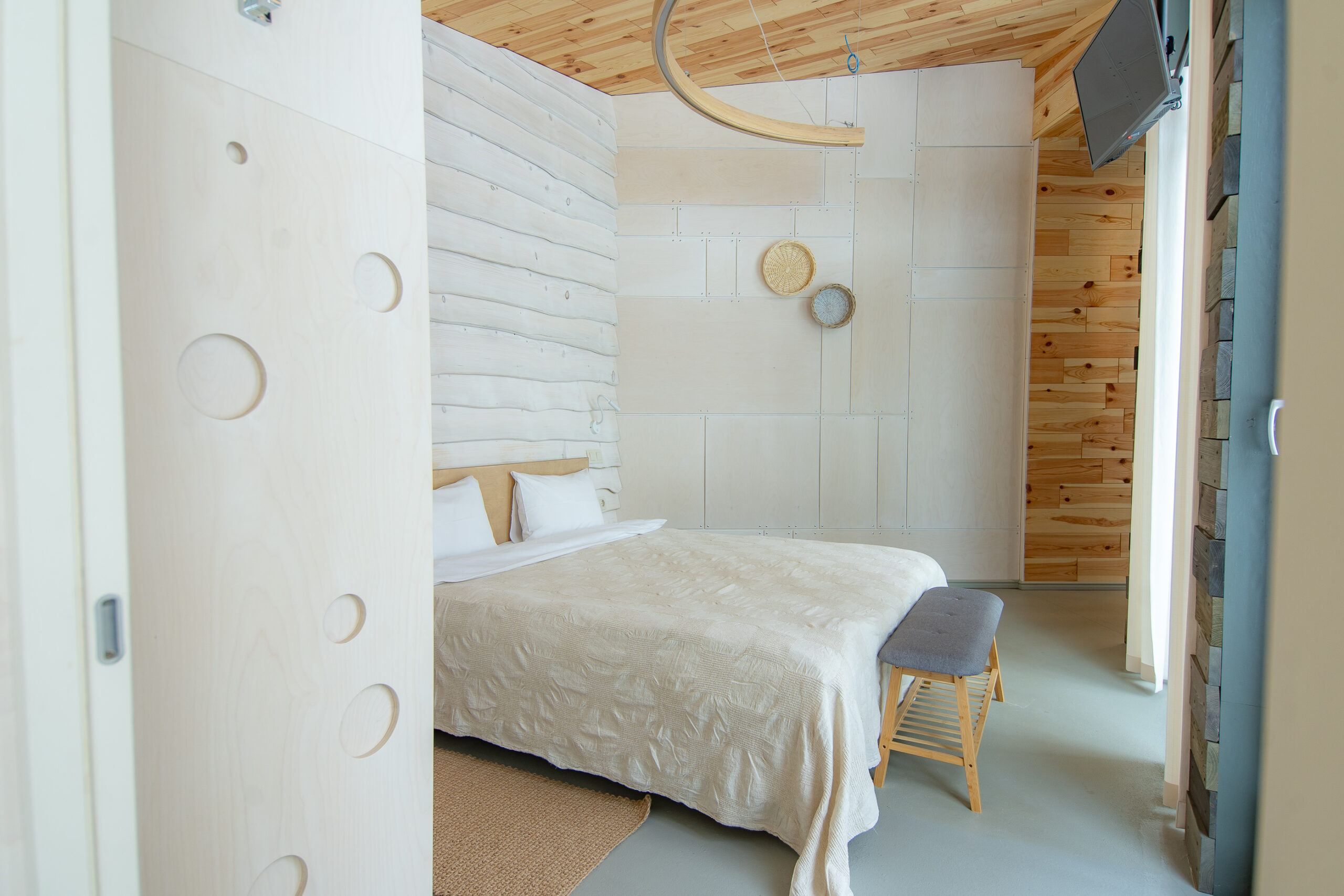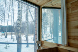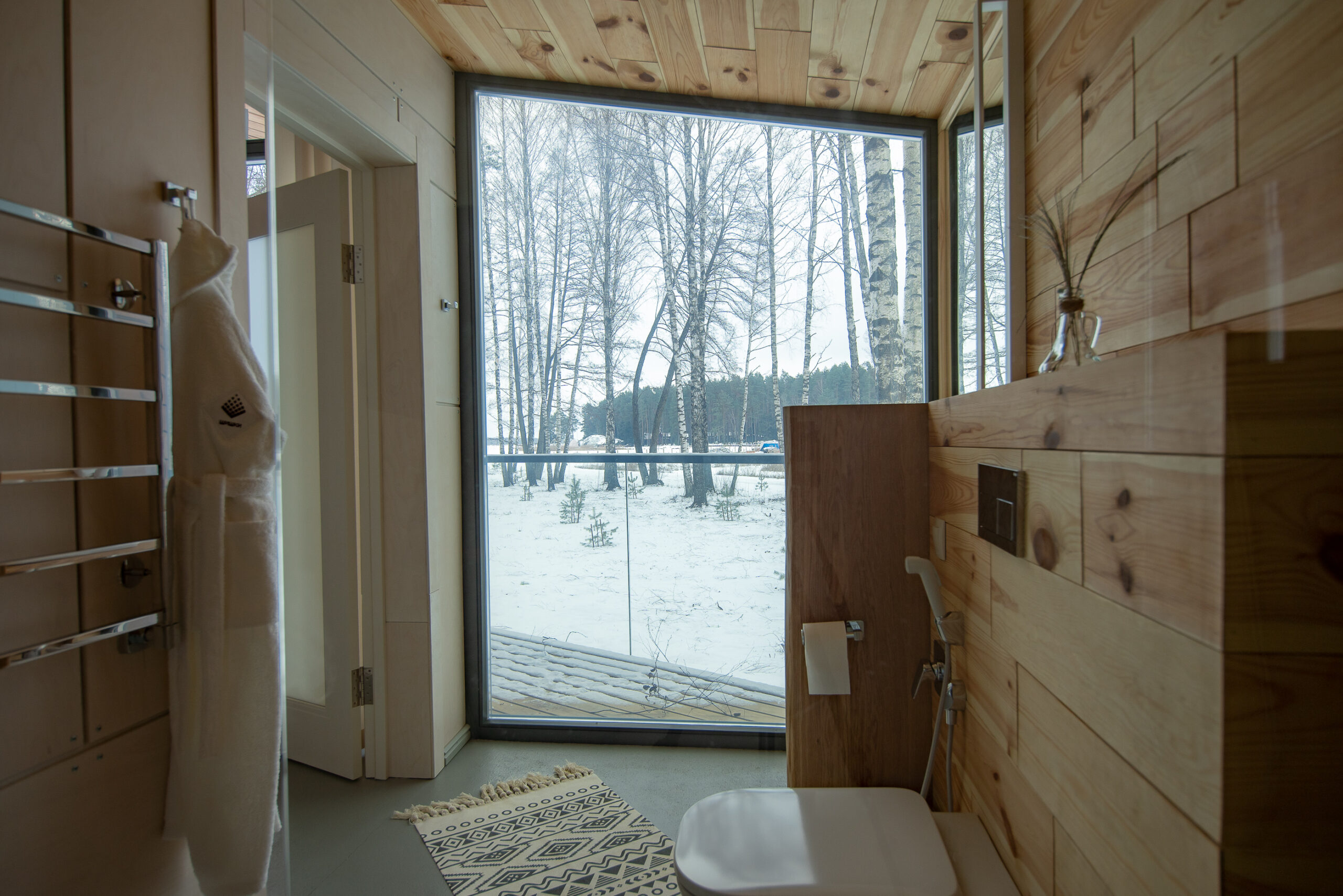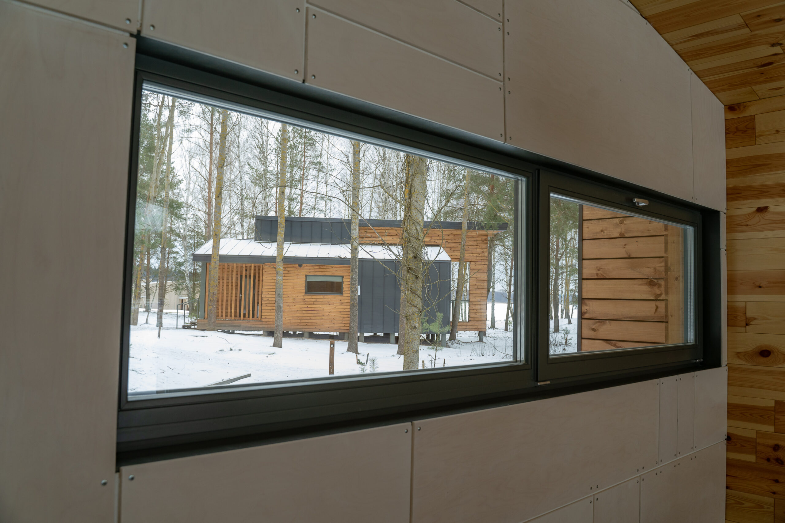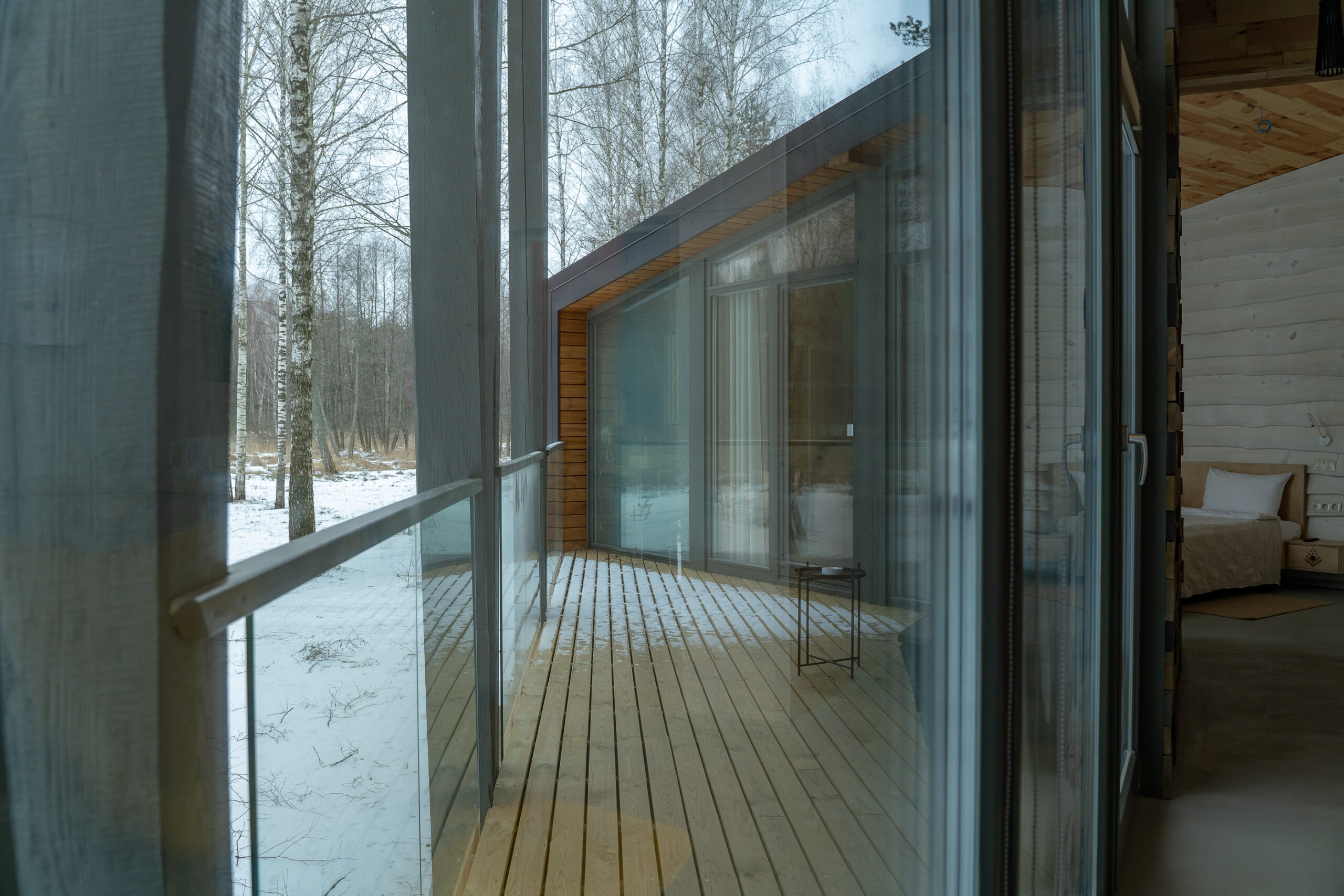 Реализованный дизайн интерьера. Главная задача дизайна дома — слияние с природой. Дом предназначен для отдыха и проживания 2-5 человек. В доме расположена спальня, сан. узел с душевой, гостиная (мини-кухня с столовой зоной, диван с камином). С террасы открывается вид на лес и озеро. Выход на террасу из гостиной и спальни. В проекте предусмотрены высокие разноуровневые потолки и большая площадь остекления- что делает пространство визуально больше. В отделке использованы натуральные материалы из дерева в трех вариациях: фанера окрашенная, отделочная доска на стенах и потолке, доска стилизованная под амбарную доску в зоне коридора и террасы. В сан. узле также использована отделка из дерева. Душевой угол сделан из широкоформатной плитки на стенах в тон дерева, на полу плитка. Зоны хранения в коридоре и спальне сделаны из отделочного материала — фанеры, который использован в доме. Отопление — водяные теплые полы по всем помещениям. Пол бетонный, окрашен специальной краской для жилых помещений.