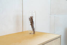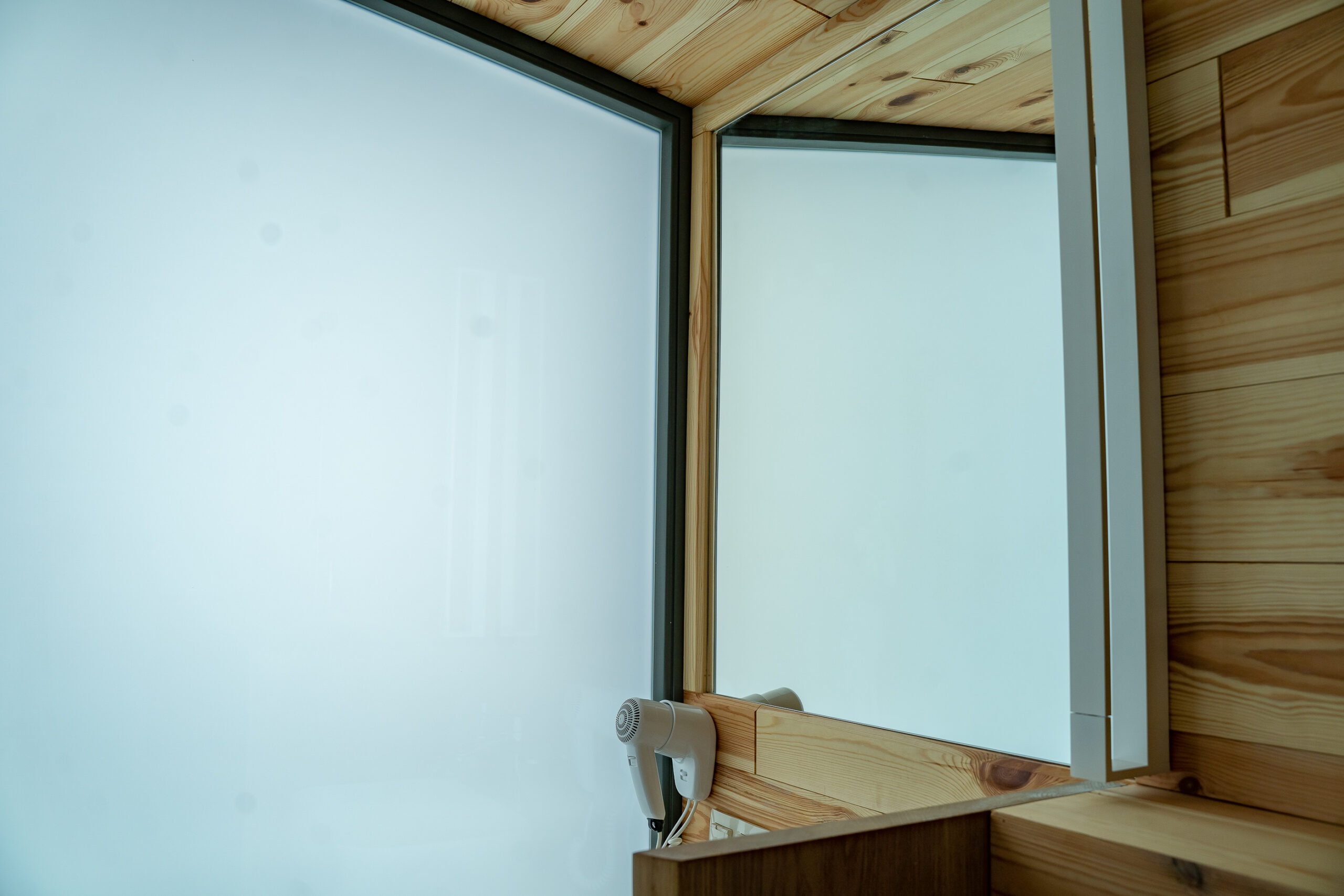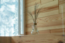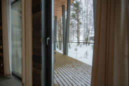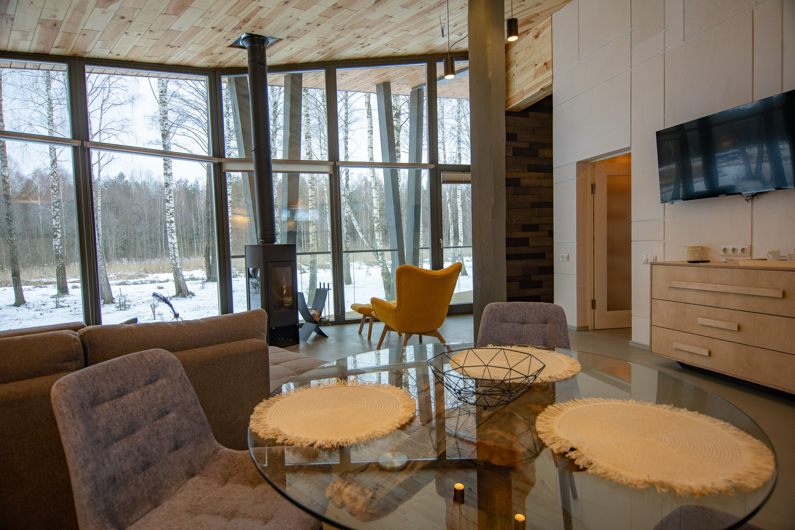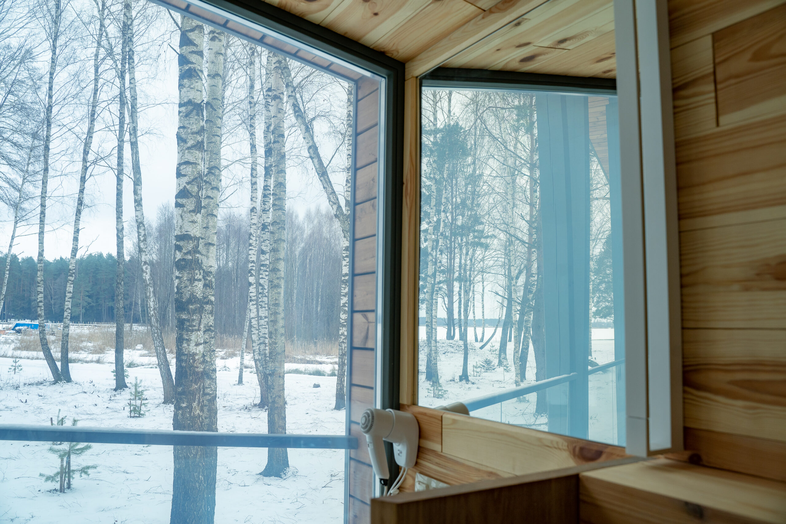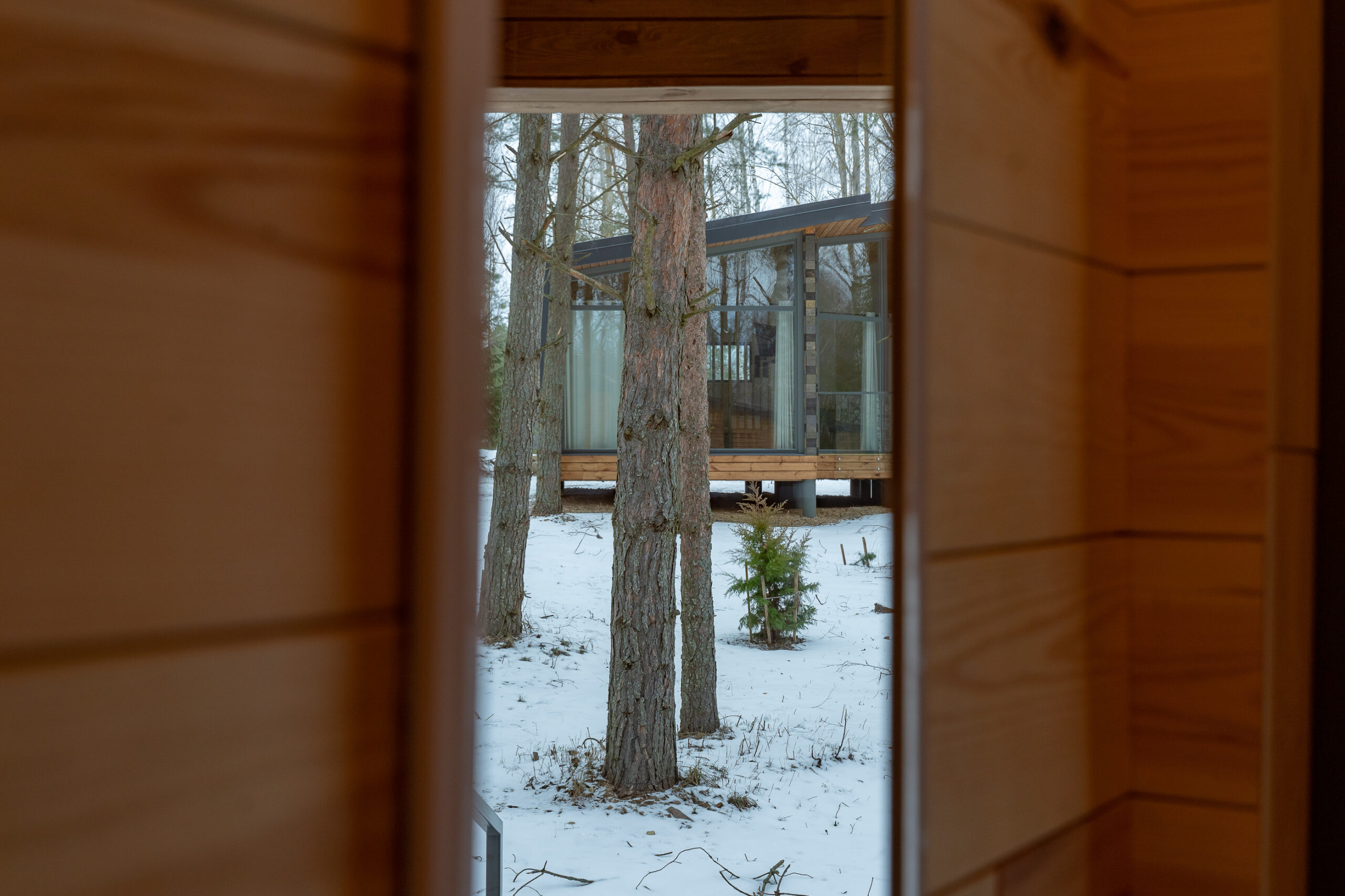 Реализованный дизайн интерьера. Главная задача дизайна дома — слияние с природой. Дом предназначен для отдыха и проживания 2-5 человек. В доме расположена спальня, сан. узел с душевой, гостиная (мини-кухня с столовой зоной, диван с камином). С террасы открывается вид на лес и озеро. Выход на террасу из гостиной и спальни. В проекте предусмотрены высокие разноуровневые потолки и большая площадь остекления- что делает пространство визуально больше. В отделке использованы натуральные материалы из дерева в трех вариациях: фанера окрашенная, отделочная доска на стенах и потолке, доска стилизованная под амбарную доску в зоне коридора и террасы. В сан. узле также использована отделка из дерева. Душевой угол сделан из широкоформатной плитки на стенах в тон дерева, на полу плитка. Зоны хранения в коридоре и спальне сделаны из отделочного материала — фанеры, который использован в доме. Отопление — водяные теплые полы по всем помещениям. Пол бетонный, окрашен специальной краской для жилых помещений.