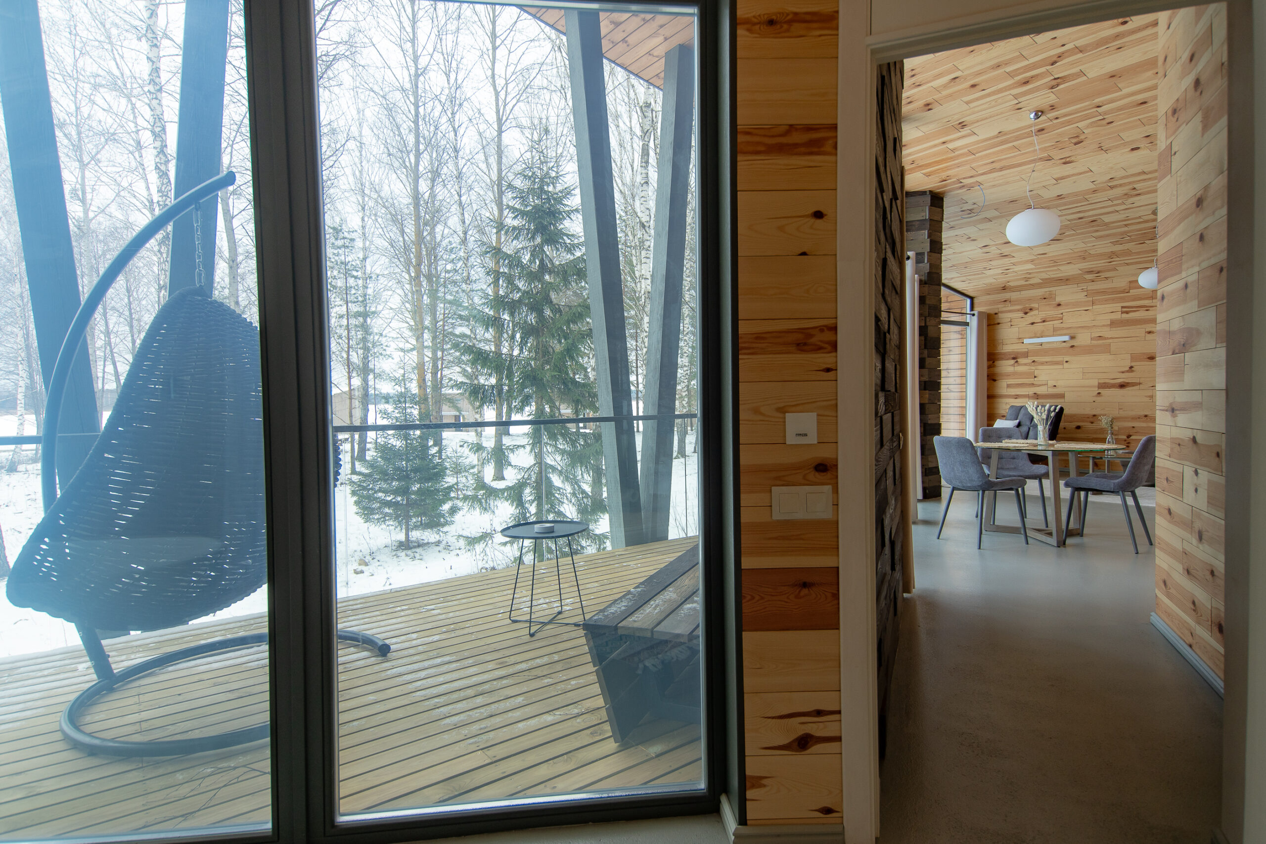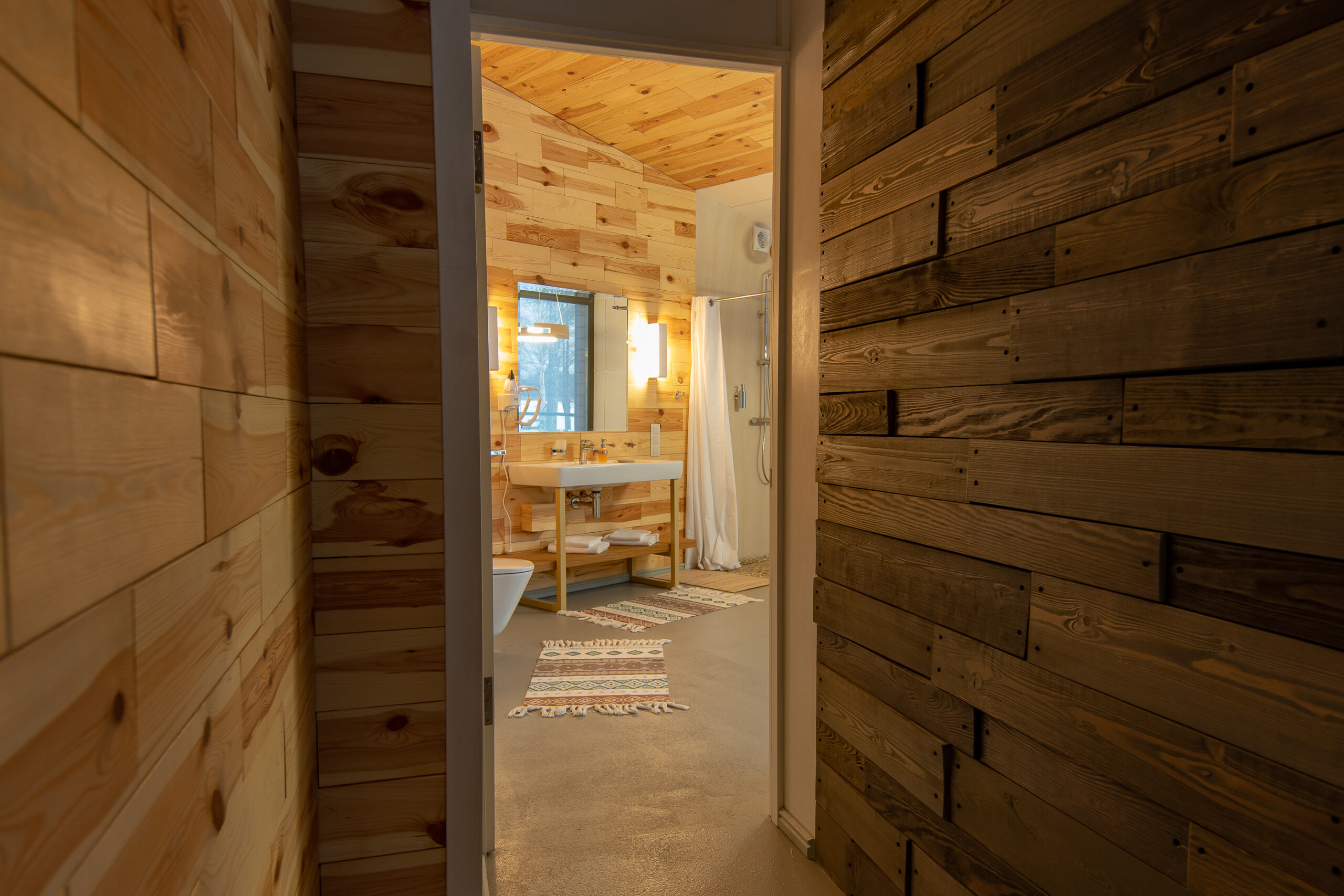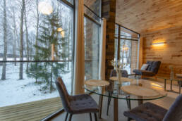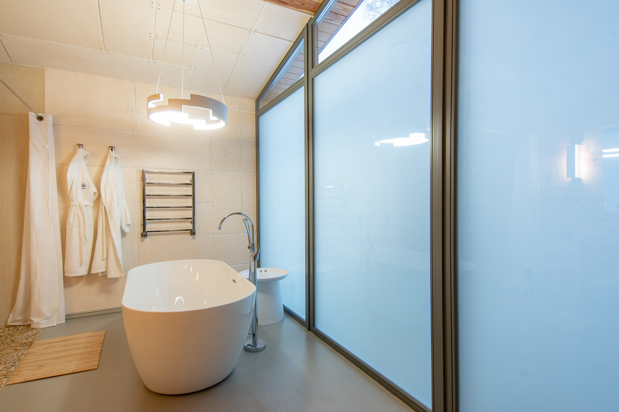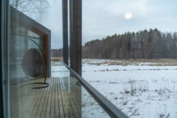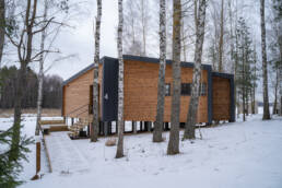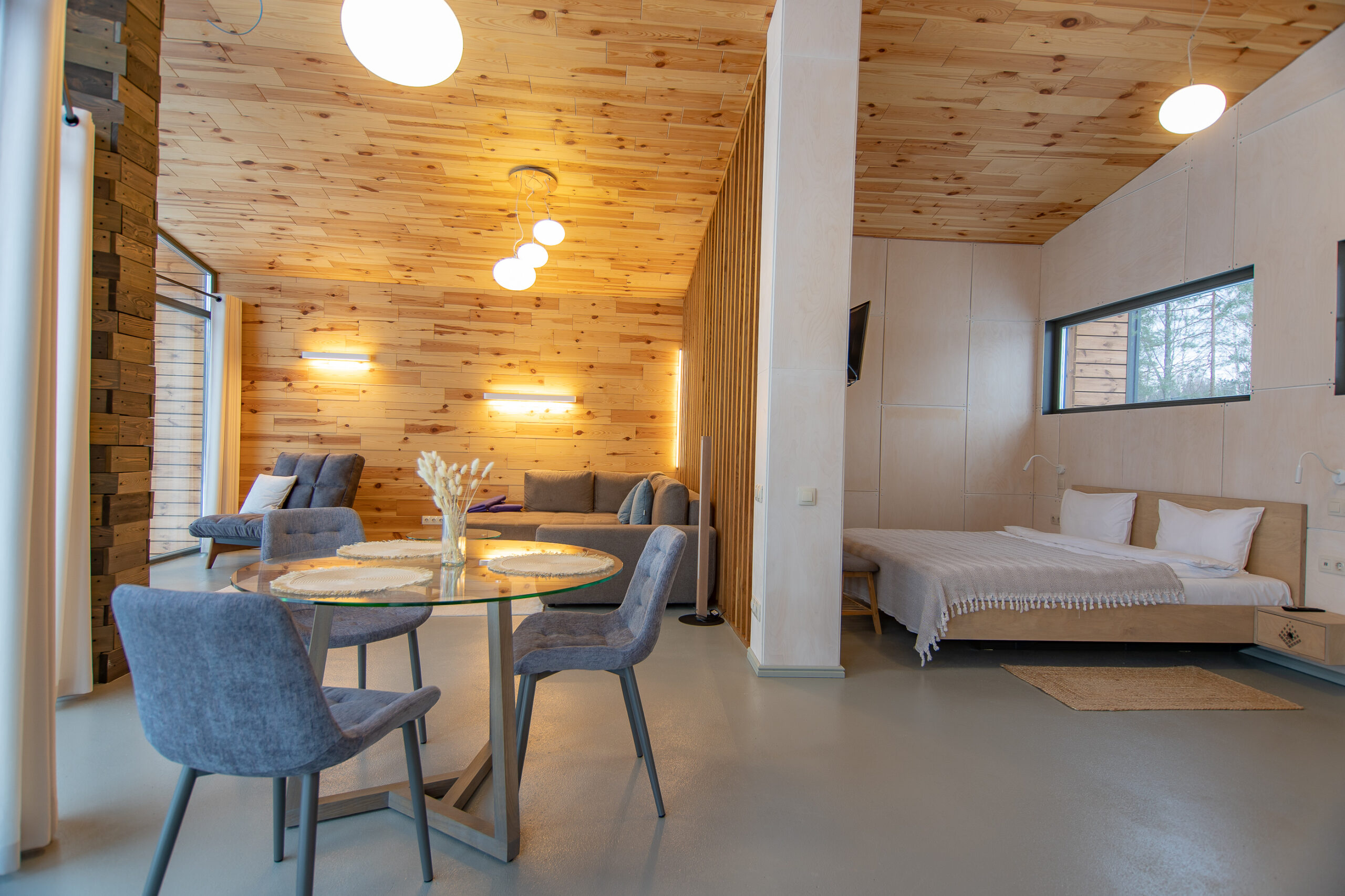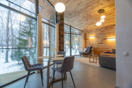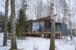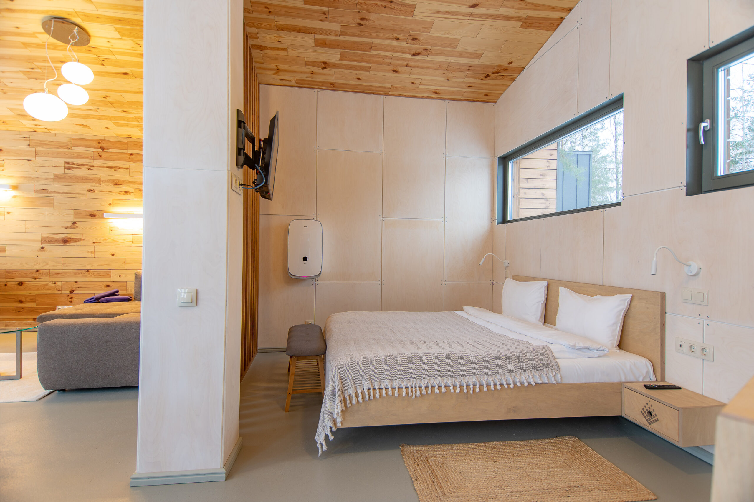 Реализованный дизайн интерьера. Главная задача дизайна дома — слияние с природой. Дом предназначен для отдыха и проживания 2-5 человек. В доме расположена ванная комната с душевой кабиной и просторной ванной, общая комната со спальным местом (отделенная перегородкой) и гостиной (мини-кухня с столовой зоной,  диван с камином). С террасы открывается вид на лес и озеро. Выход на террасу из гостиной. В проекте предусмотрены высокие разноуровневые потолки и большая площадь остекления-  что делает пространство визуально больше. В отделке использованы натуральные материалы из дерева в трех вариациях: фанера окрашенная, отделочная доска на стенах и потолке, доска стилизованная под амбарную доску в зоне коридора и террасы. В сан. узле также использована отделка из дерева. Душевой угол сделан из широкоформатной плитки на стенах в тон дерева, на полу галька. Зоны хранения в коридоре и спальне сделаны из отделочного материала — фанеры, который использован в доме. Отопление — водяные теплые полы по всем помещениям. Пол бетонный, окрашен специальной краской для жилых помещений.