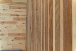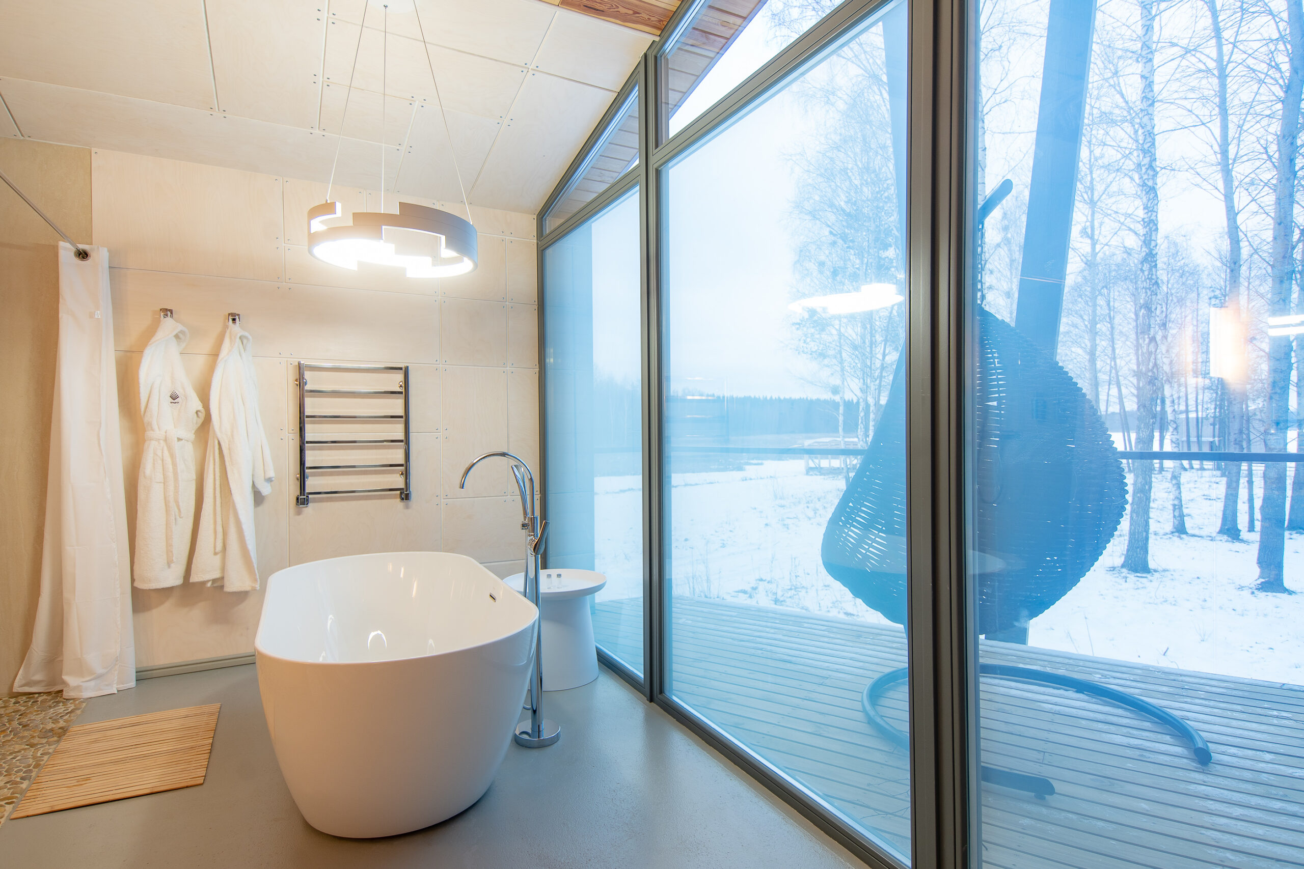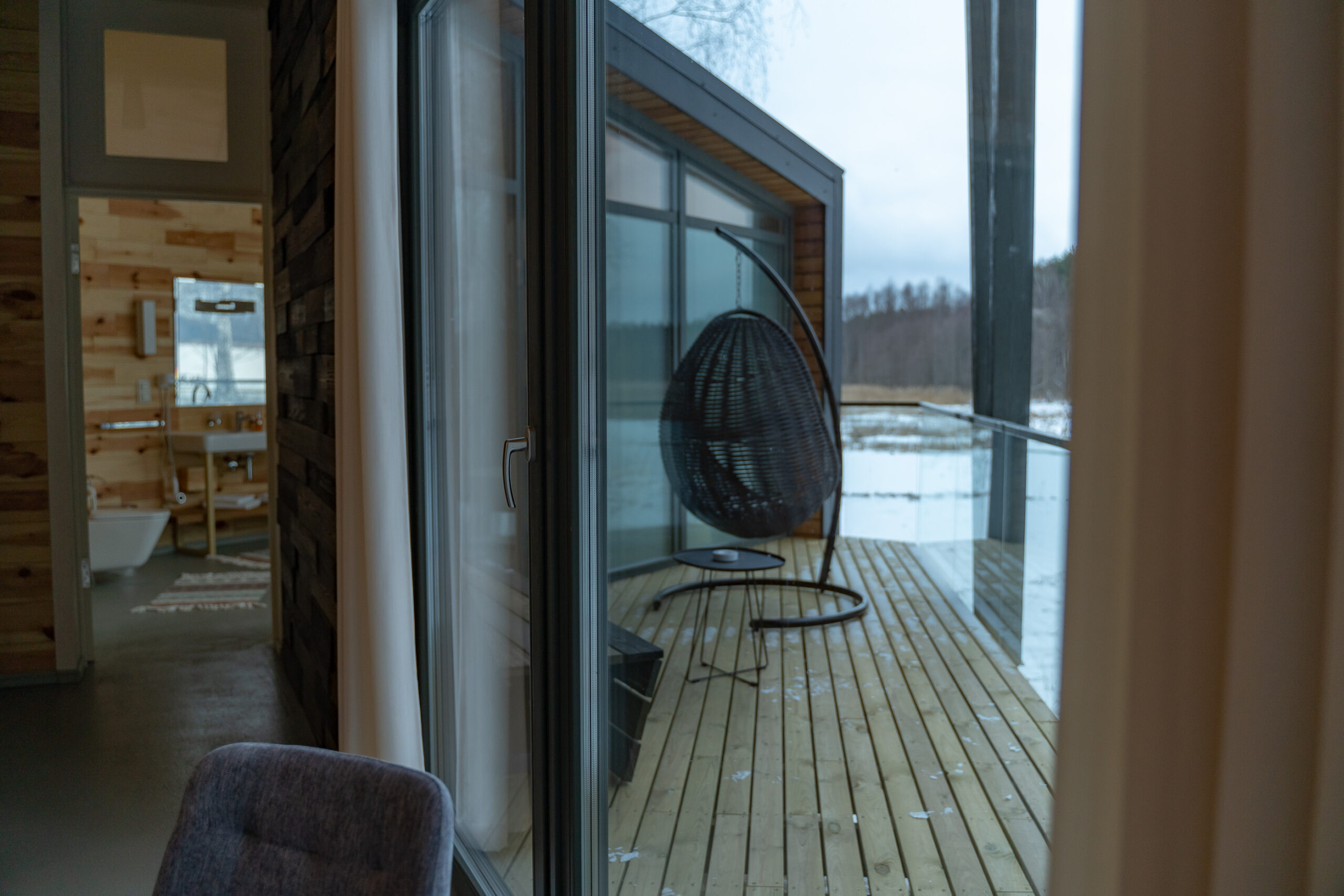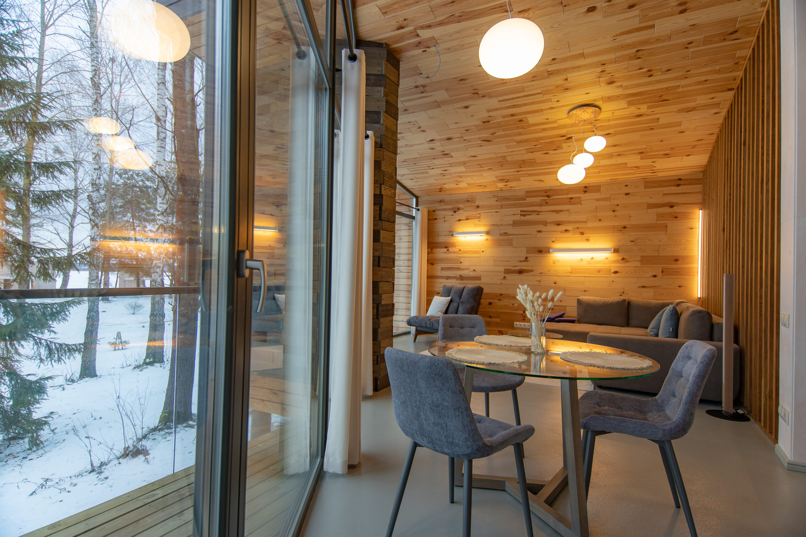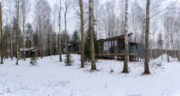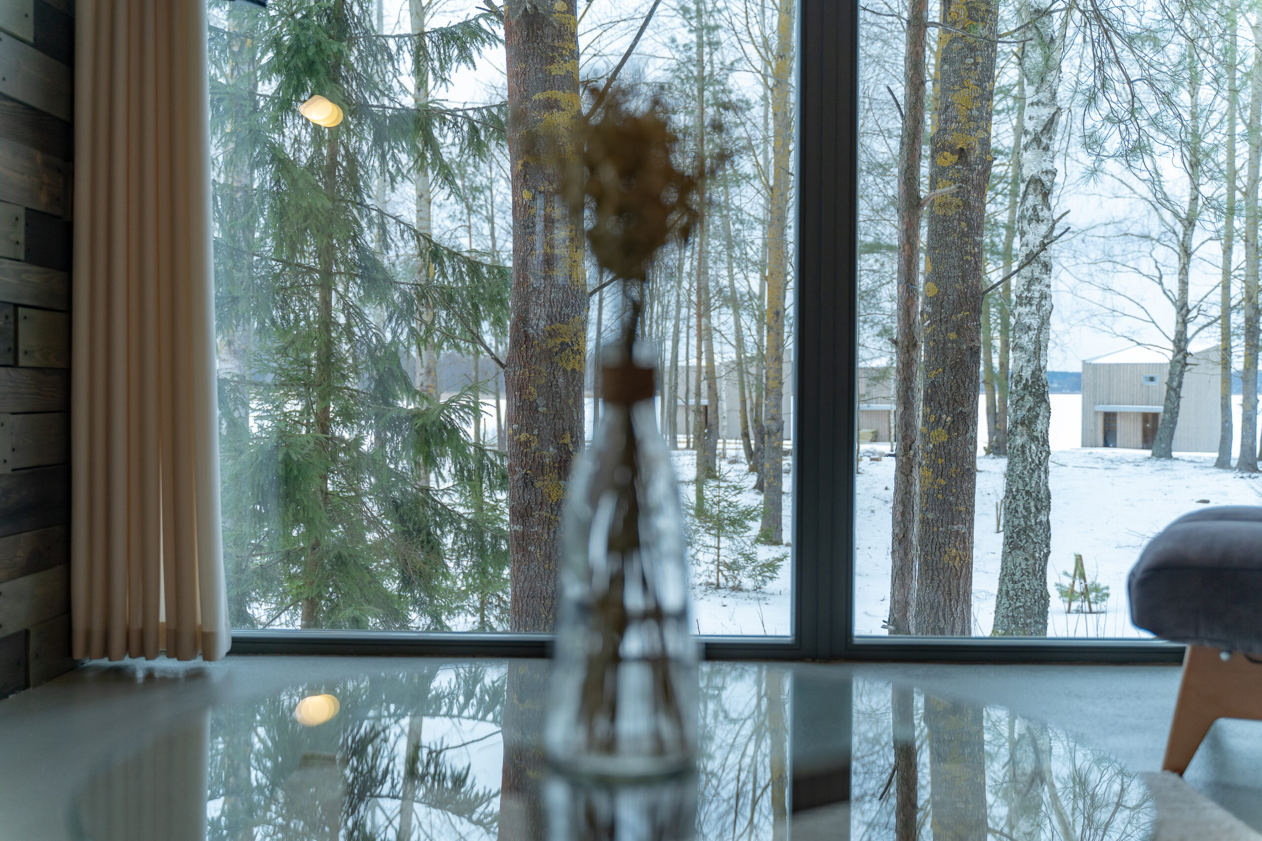 Реализованный дизайн интерьера. Главная задача дизайна дома — слияние с природой. Дом предназначен для отдыха и проживания 2-5 человек. В доме расположена ванная комната с душевой кабиной и просторной ванной, общая комната со спальным местом (отделенная перегородкой) и гостиной (мини-кухня с столовой зоной,  диван с камином). С террасы открывается вид на лес и озеро. Выход на террасу из гостиной. В проекте предусмотрены высокие разноуровневые потолки и большая площадь остекления-  что делает пространство визуально больше. В отделке использованы натуральные материалы из дерева в трех вариациях: фанера окрашенная, отделочная доска на стенах и потолке, доска стилизованная под амбарную доску в зоне коридора и террасы. В сан. узле также использована отделка из дерева. Душевой угол сделан из широкоформатной плитки на стенах в тон дерева, на полу галька. Зоны хранения в коридоре и спальне сделаны из отделочного материала — фанеры, который использован в доме. Отопление — водяные теплые полы по всем помещениям. Пол бетонный, окрашен специальной краской для жилых помещений.