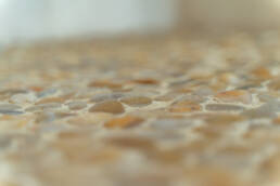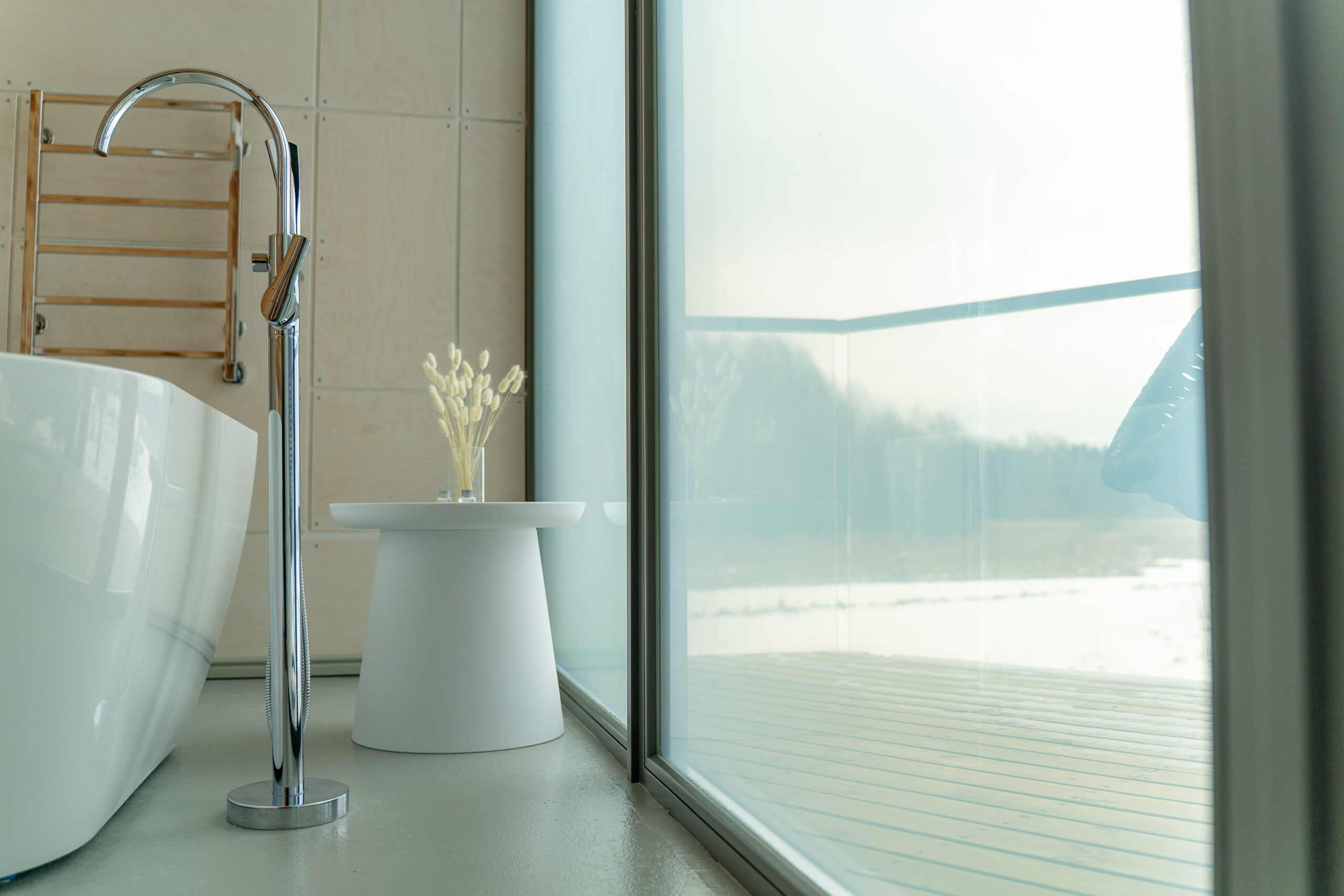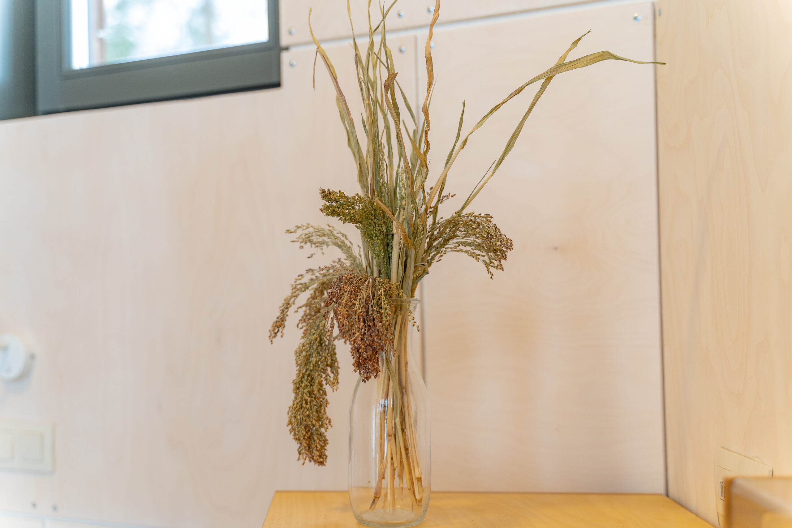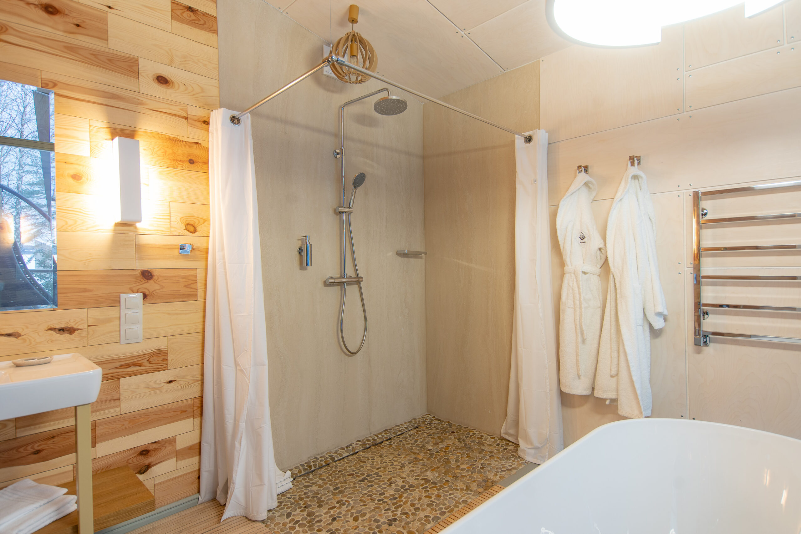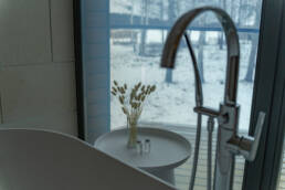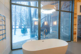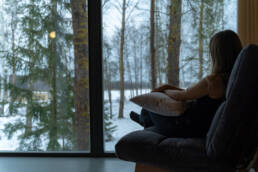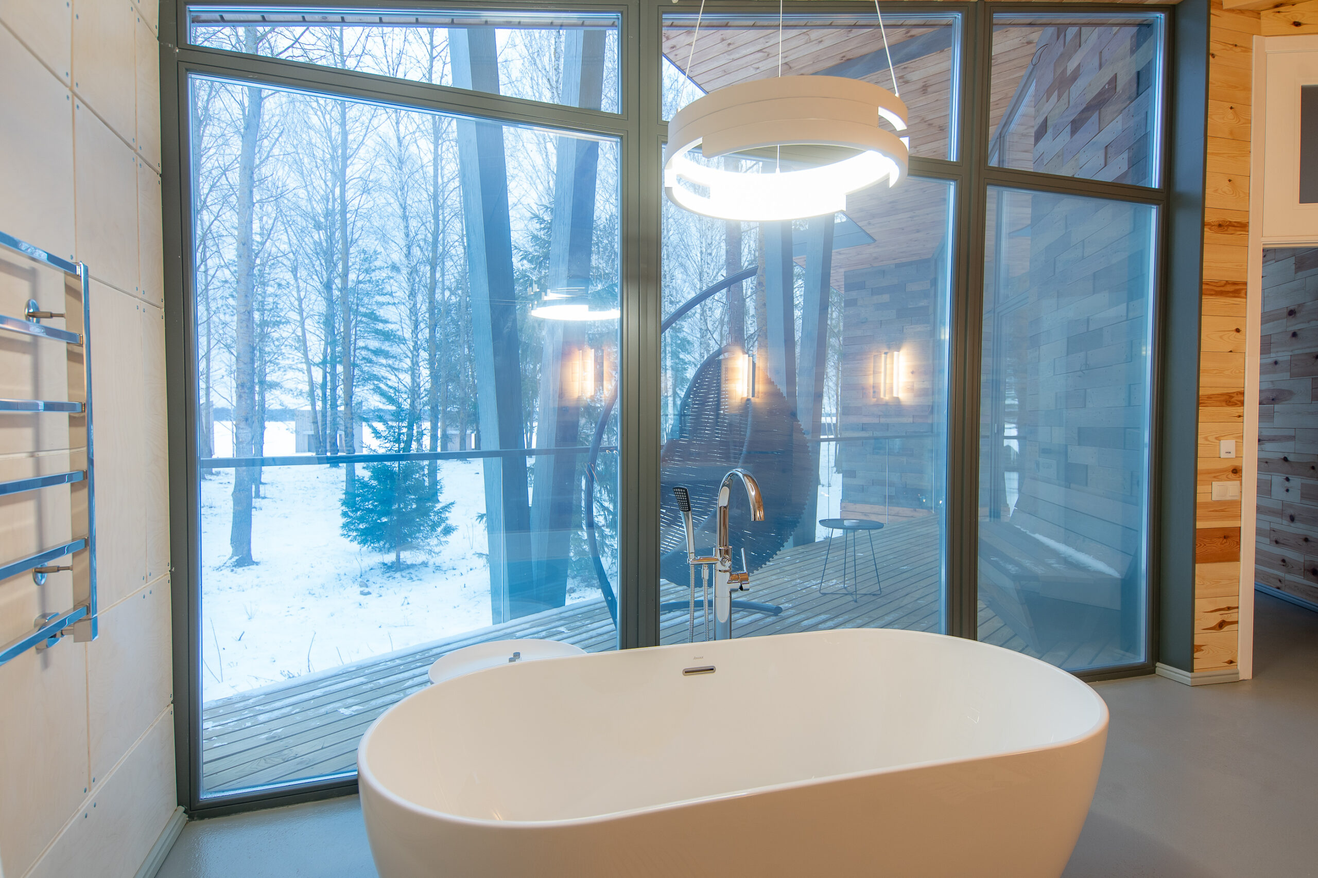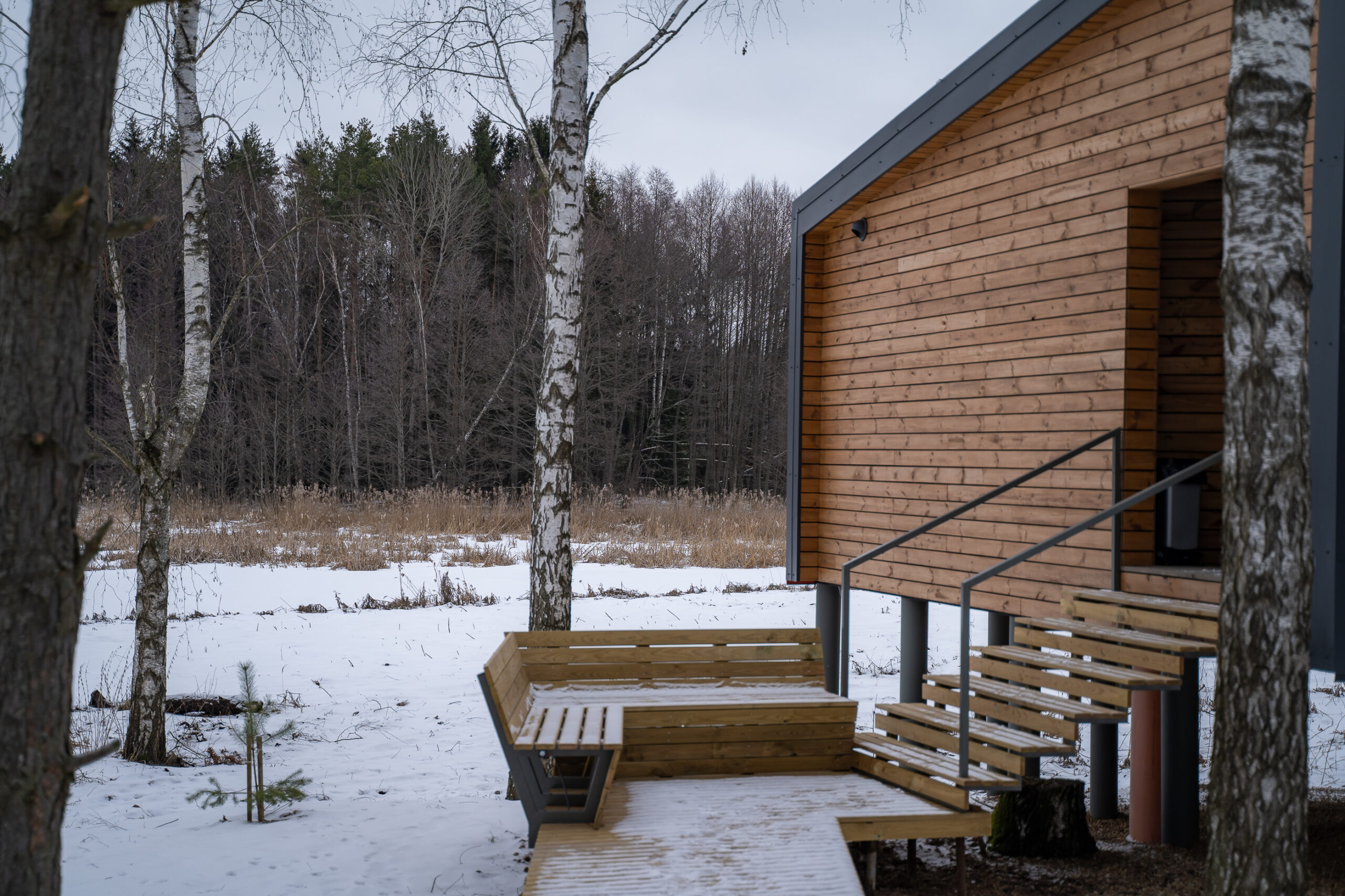 Реализованный дизайн интерьера. Главная задача дизайна дома — слияние с природой. Дом предназначен для отдыха и проживания 2-5 человек. В доме расположена ванная комната с душевой кабиной и просторной ванной, общая комната со спальным местом (отделенная перегородкой) и гостиной (мини-кухня с столовой зоной,  диван с камином). С террасы открывается вид на лес и озеро. Выход на террасу из гостиной. В проекте предусмотрены высокие разноуровневые потолки и большая площадь остекления-  что делает пространство визуально больше. В отделке использованы натуральные материалы из дерева в трех вариациях: фанера окрашенная, отделочная доска на стенах и потолке, доска стилизованная под амбарную доску в зоне коридора и террасы. В сан. узле также использована отделка из дерева. Душевой угол сделан из широкоформатной плитки на стенах в тон дерева, на полу галька. Зоны хранения в коридоре и спальне сделаны из отделочного материала — фанеры, который использован в доме. Отопление — водяные теплые полы по всем помещениям. Пол бетонный, окрашен специальной краской для жилых помещений.